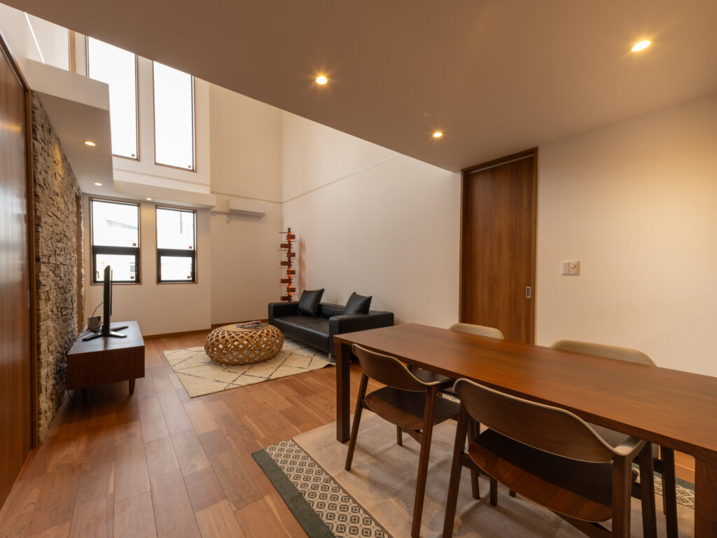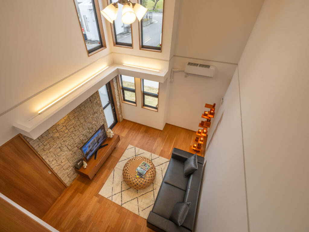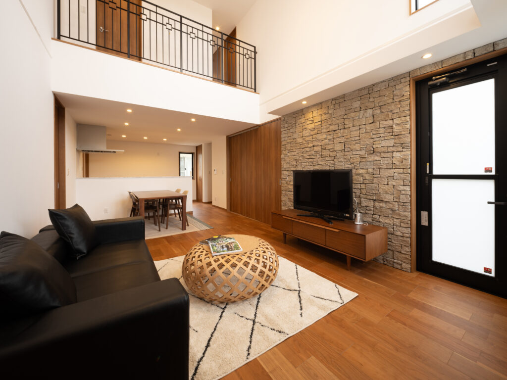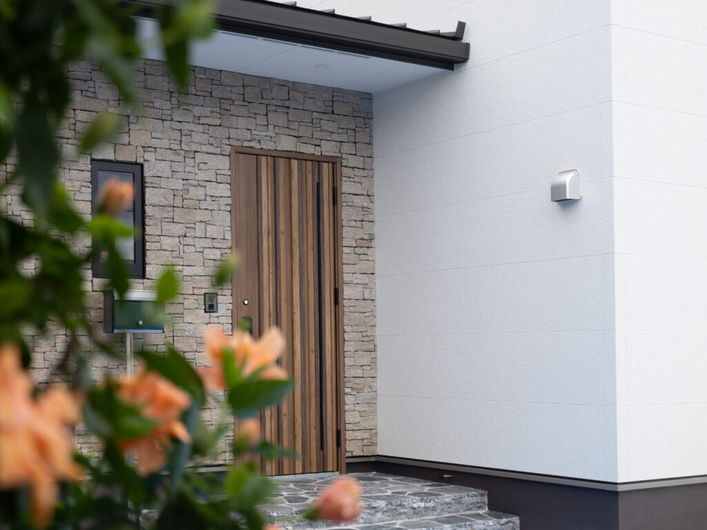 白を基調とした外壁に、石調サイディングと木目の玄関扉を組み合わせ、シンプルで洗練された印象の中に温かみを添えています。直線的なフォルム構成が都会的でありながら、素材感がやわらかさを生み出しています。凹凸を持たせた外壁構成により、光と影のコントラストが生まれ、奥行き感のある外観に。